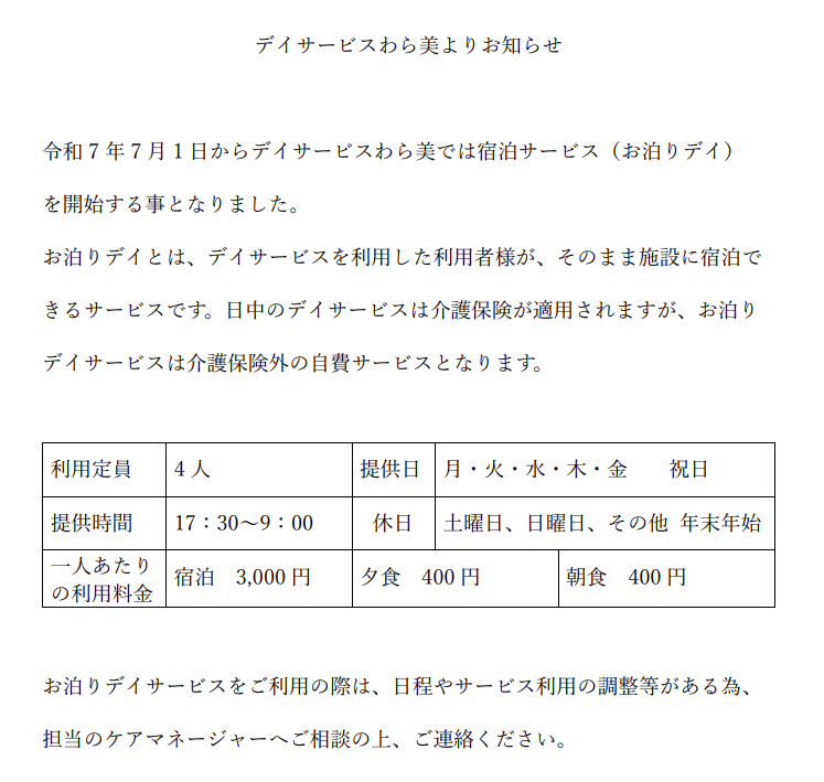 わら美デイサービスをご利用いただき、誠にありがとうございます。